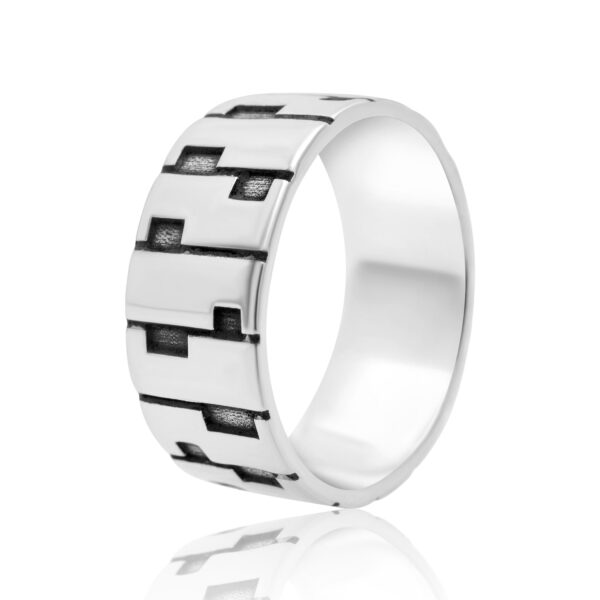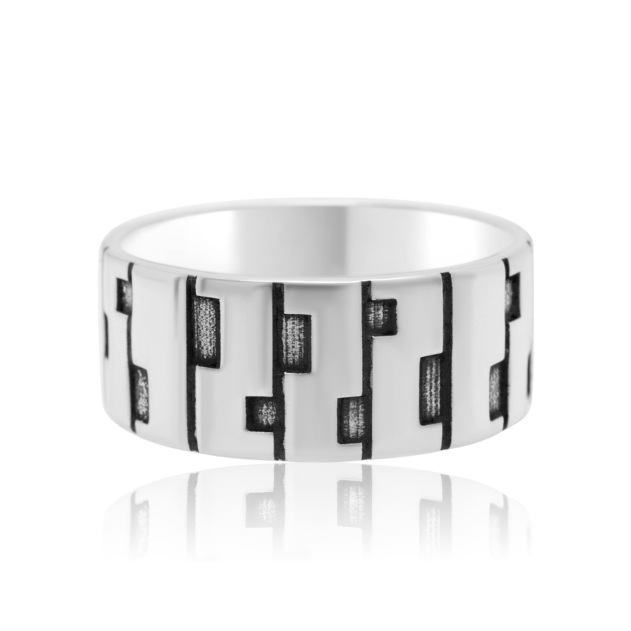 Minimalist yet bold, this ring is perfect for those drawn to graphic design, architecture, and precision. Its clean lines and symmetrical pattern make it a unique unisex band, whether worn as a statement piece or a subtle nod to structure and meaning.