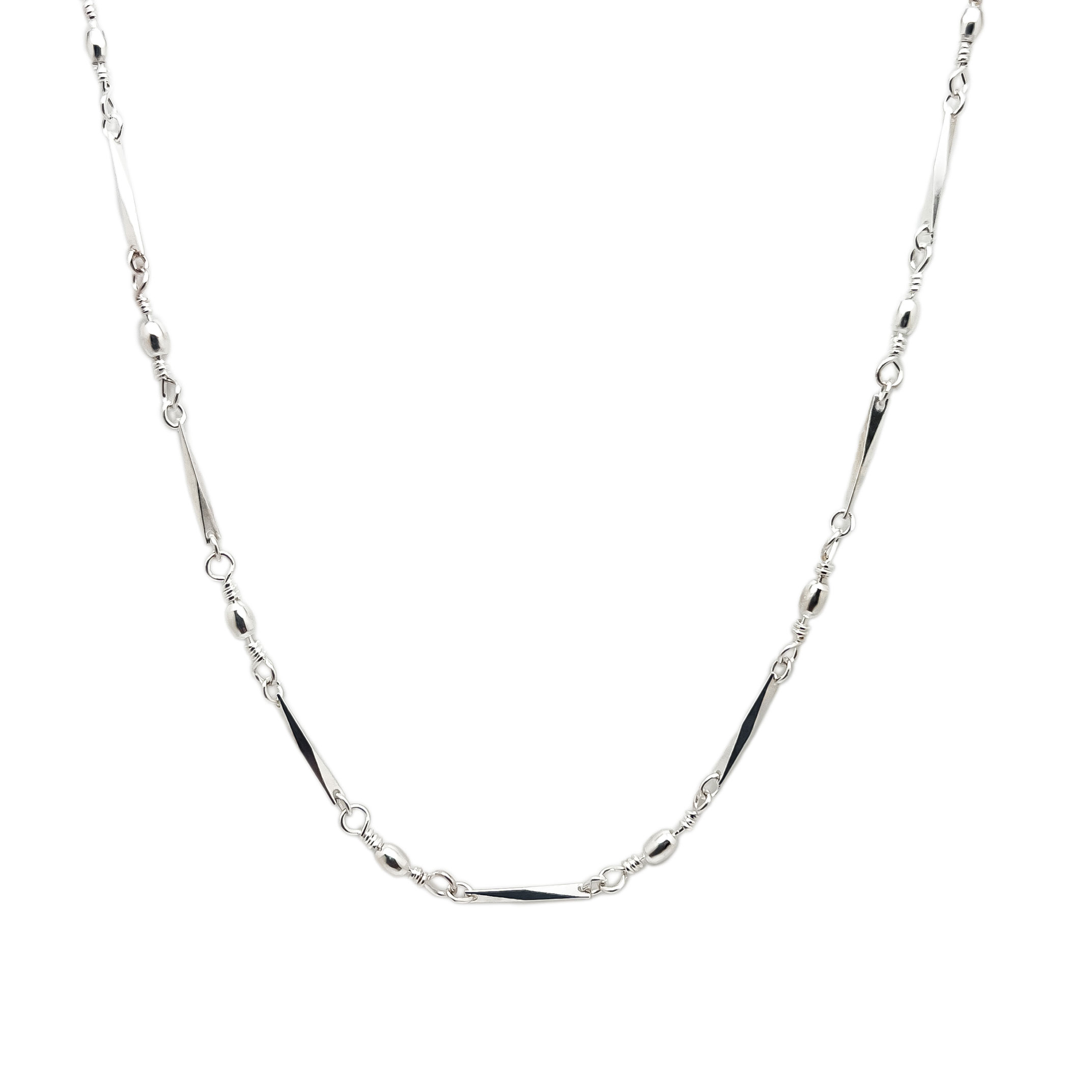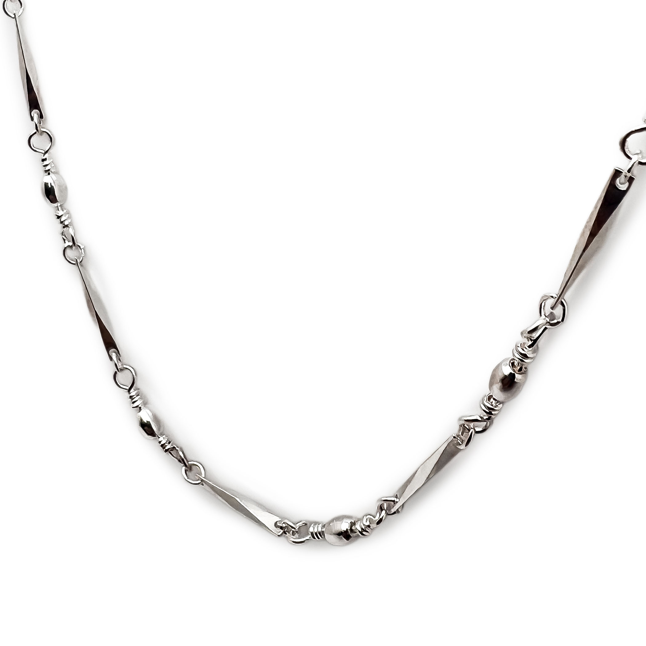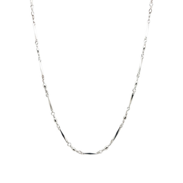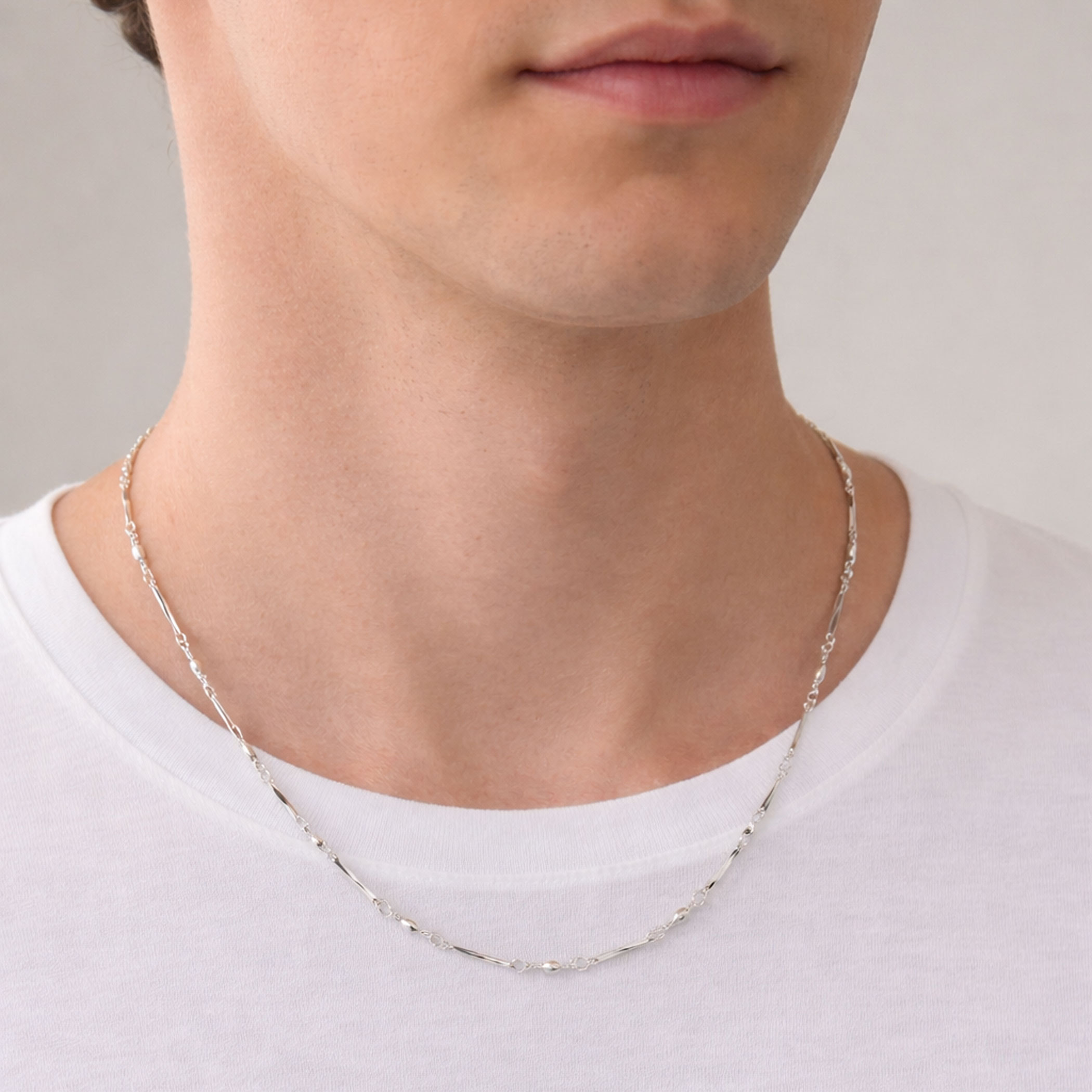 This delicate sterling silver 925 chain necklace features elongated geometric links combined with subtle handcrafted elements, creating a refined and fluid rhythm around the neck.